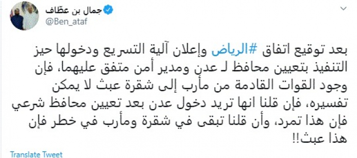 وكتب في تغريدة عبر "تويتر" رصدها "المشهد العربي": "بعد توقيع اتفاق الرياض وإعلان آلية التسريع ودخولها حيز التنفيذ بتعيين محافظ لـ عدن ومدير أمن متفق عليهما، فإن وجود القوات القادمة من مأرب إلى شقرة عبث لا يمكن تفسيره".