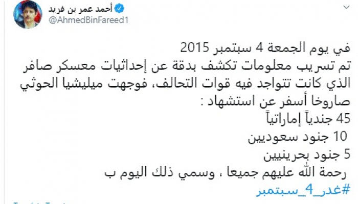 وقال في تغريدة عبر "تويتر" رصدها "المشهد العربي": "في يوم الجمعة 4 سبتمبر 2015 تم تسريب معلومات تكشف بدقة عن إحداثيات معسكر صافر الذي كانت تتواجد فيه قوات التحالف، فوجهت مليشيا الحوثي صاروخًا أسفر عن استشهاد: 45 جنديًا إماراتيًا 10 جنود سعوديين 5 جنود بحرينيين رحمة الله عليهم جميعًا، وسمي ذلك اليوم بغدر 4 سبتمبر".