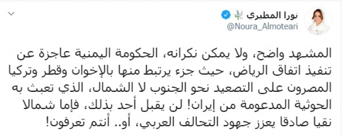 وكتبت عبر تغريدة لها على "تويتر" رصدها "المشهد العربي": "المشهد واضح، ولا يمكن نكرانه، الحكومة اليمنية عاجزة عن تنفيذ اتفاق الرياض، حيث جزء يرتبط منها بالإخوان وقطر وتركيا المصرين على التصعيد نحو الجنوب لا الشمال، الذي تعبث به الحوثية المدعومة من إيران، لن يقبل أحد بذلك، فإما ""شمال نقي صادق" يعزز جهود التحالف العربي، أو.. أنتم تعرفون".