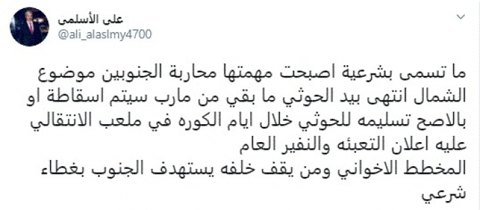 الأسلمي: الإخوان يستهدفون الجنوب بغطاء شرعي.. وعلى الانتقالي إعلان النفير العام