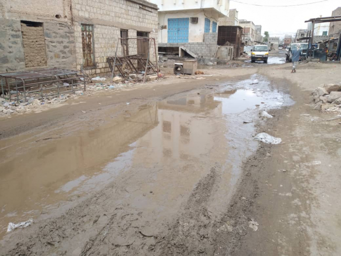 انتشرت البحيرات الراكدة في شوارع مدينة الحصن بجعار في أبين، بسبب مياه الأمطار التي شهدتها المحافظة مؤخرًا.