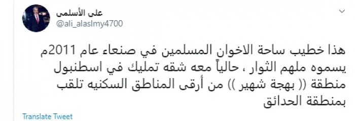 وقال في تغريدة عبر "تويتر" رصدها "المشهد العربي": "هذا خطيب ساحة الإخوان المسلمين في صنعاء عام 2011م يسموه ملهم الثوار، حاليًا معه شقه تمليك في إسطنبول منطقة ((بهجة شهير)) من أرقى المناطق السكنية تلقب بمنطقة الحدائق".