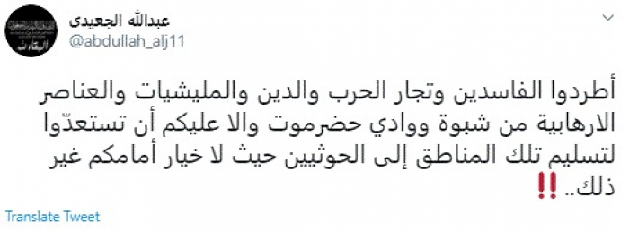 وقال في تغريدة عبر "تويتر" رصدها "المشهد العربي": "اطردوا الفاسدين وتجار الحرب والدين والمليشيات والعناصر الإرهابية من شبوة ووادي حضرموت وإلا عليكم أن تستعدّوا لتسليم تلك المناطق إلى الحوثيين حيث لا خيار أمامكم غير ذلك".