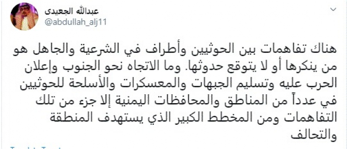وقال في تغريدة عبر "تويتر" رصدها "المشهد العربي": "هناك تفاهمات بين الحوثيين وأطراف في الشرعية والجاهل هو من ينكرها أو لا يتوقع حدوثها".