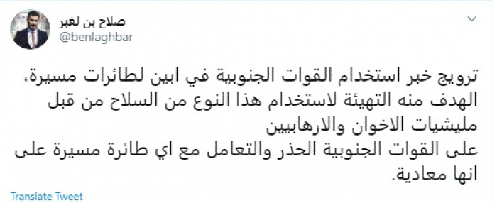وقال في تغريدة عبر "تويتر" رصدها "المشهد العربي": "ترويج خبر استخدام القوات الجنوبية في أبين لطائرات مسيرة، الهدف منه التهيئة لاستخدام هذا النوع من السلاح من قبل مليشيات الإخوان والإرهابيين".