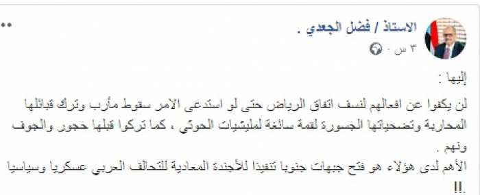 وكتب عبر تغريدة له على "تويتر" رصدها "المشهد العربي": "لن يكفوا عن أفعالهم لنسف اتفاق الرياض حتى لو استدعى الأمر سقوط مأرب وترك قبائلها المحاربة وتضحياتها الجسورة لقمة سائغة لمليشيات الحوثي، كما تركوا قبلها حجور والجوف ونهم، الأهم لدى هؤلاء هو فتح جبهات جنوبا تنفيذا للأجندة المعادية للتحالف العربي عسكريا وسياسيا".