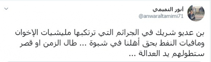 وكتب عبر تغريدة له على "تويتر" رصدها "المشهد العربي": "بن عديو شريك في الجرائم التي ترتكبها مليشيات الإخوان ومافيات النفط بحق أهلنا في شبوة، طال الزمن أو قصر ستطولهم يد العدالة".