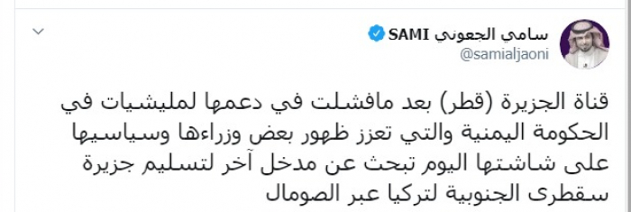 وكتب عبر تغريدة له على "تويتر" رصدها "المشهد العربي": "قناة الجزيرة (قطر) بعد ما فشلت في دعمها لمليشيات في الحكومة اليمنية والتي تعزز ظهور بعض وزرائها وسياسييها على شاشتها، اليوم تبحث عن مدخل آخر لتسليم جزيرة سقطرى الجنوبية لتركيا عبر الصومال".
