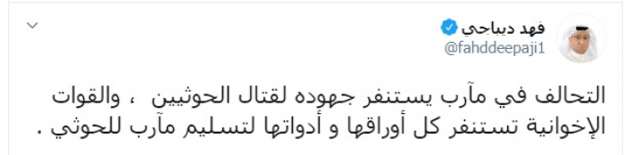 وكتب عبر تغريدة له على "تويتر" رصدها "المشهد العربي": "التحالف في مأرب يستنفر جهوده لقتال الحوثيين، والقوات الإخوانية تستنفر كل أوراقها وأدواتها لتسليم مأرب للحوثي".