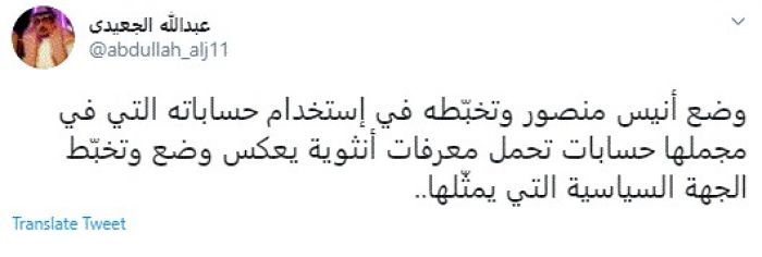 وكتب في تغريدة عبر "تويتر" رصدها "المشهد العربي": "وضع أنيس منصور وتخبّطه في استخدام حساباته التي في مجملها حسابات تحمل معرفات أنثوية يعكس وضع وتخبّط الجهة السياسية التي يمثّلها".