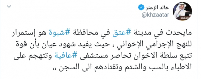 وكتب عبر تغريدة له على "تويتر" رصدها "المشهد العربي": "ما يحدث في مدينة عتق في محافظة شبوة هو استمرار للنهج الإجرامي الإخواني، حيث يفيد شهود عيان بأن قوة تتبع سلطة الإخوان تحاصر مستشفى عافية وتتهجم على الأطباء بالسب والشتم وتقتادهم إلى السجن".