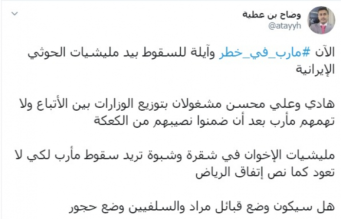 وكتب عبر تغريدة له على "تويتر" رصدها "المشهد العربي": "الآن مأرب في خطر وآيلة للسقوط بيد مليشيات الحوثي الإيرانية، هادي وعلي محسن مشغولان بتوزيع الوزارات بين الأتباع ولا تهمهم مأرب بعد أن ضمنوا نصيبهم من الكعكة، مليشيات الإخوان في شقرة وشبوة تريد سقوط مأرب لكي لا تعود كما نص اتفاق الرياض، هل سيكون وضع قبائل مراد والسلفيين وضع حجور".