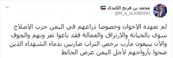 وكتب عبر تغريدة له على "تويتر" رصدها "المشهد العربي": "لم نعهد الإخوان وخصوصا ذراعهم في اليمن حزب الإصلاح سوى بالخيانة والارتزاق والعمالة فقد باعوا تعز ونهم والجوف والآن يبيعون مأرب برخص التراب ضاربين بدماء الشهداء الذين ضحوا بأرواحهم لأجل اليمن عرض الحائط".