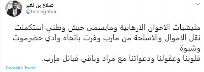 وكتب في تغريدة عبر "تويتر" رصدها "المشهد العربي": "مليشيات الإخوان الإرهابية وما يسمى جيش وطني استكملت نقل الأموال والأسلحة من مأرب وفرت باتجاه وادي حضرموت وشبوة".