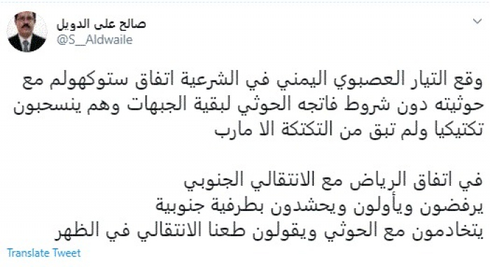 الدويل مُهاجمًا الشرعية: يتخادمون مع الحوثي.. ووقعوا اتفاق ستوكهولم دون شروط