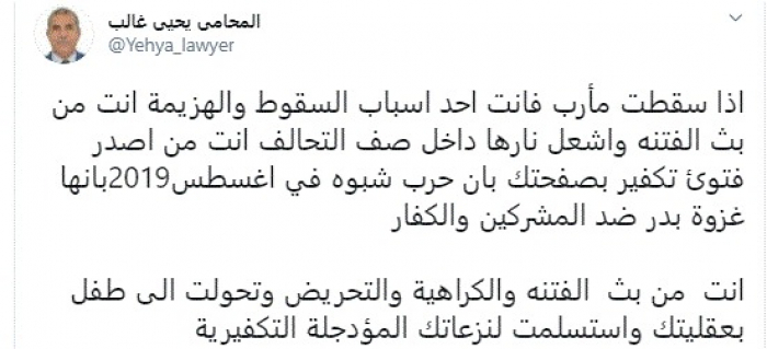 وأضاف: "أنت من بث الفتنة والكراهية والتحريض وتحولت إلى طفل بعقليتك واستسلمت لنزعاتك المؤدجلة التكفيرية".
