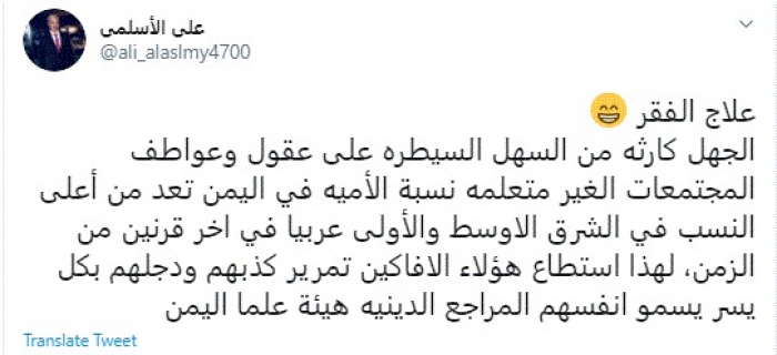 وقال في تغريدة عبر "تويتر" رصدها "المشهد العربي": "علاج الفقر.. الجهل كارثة من السهل السيطرة على عقول وعواطف المجتمعات الغير متعلمة نسبة الأمية في اليمن تعد من أعلى النسب في الشرق الأوسط والأولى عربيًا في آخر قرنين من الزمن".