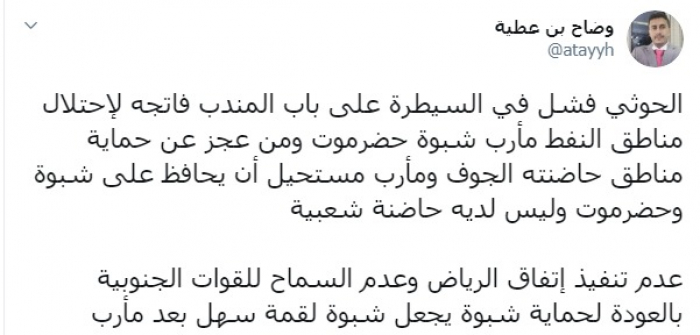 وكتب عبر تغريدة له على "تويتر" رصدها "المشهد العربي": "الحوثي فشل في السيطرة على باب المندب فاتجه لاحتلال مناطق النفط مأرب، شبوة، حضرموت ومن عجز عن حماية مناطق حاضنته الجوف، ومأرب مستحيل أن يحافظ على شبوة وحضرموت وليس لديه حاضنة شعبية. عدم تنفيذ اتفاق الرياض وعدم السماح للقوات الجنوبية بالعودة لحماية شبوة يجعل شبوة لقمة سهلة بعد مأرب".