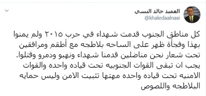 وكتب عبر تغريدة له على "تويتر" رصدها "المشهد العربي": "كل مناطق الجنوب قدمت شهداء في حرب ٢٠١٥ ولم يمنوا بهذا وفجأة ظهر على الساحة بلاطجة مع أطقم ومرافقين تحت شعار نحن مناضلون قدمنا شهداء ونهبوا ودمروا وقتلوا، يجب أن تبقى القوات الجنوبية تحت قيادة واحدة والقوات الأمنية تحت قيادة واحدة مهمتها تثبيت الأمن وليس حماية البلاطجة واللصوص".