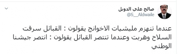 وكتب عبر تغريدة له على "تويتر" رصدها "المشهد العربي": "عندما تنهزم مليشيات الإخوانج يقولون، القبائل سرقت السلاح وهربت وعندما تنتصر القبائل يقولون، انتصر جيشنا الوطني".