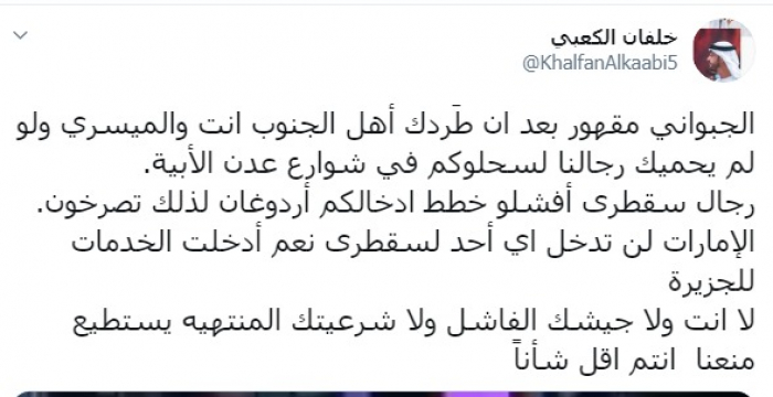 وكتب عبر تغريدة له على "تويتر" رصدها "المشهد العربي": "الجبواني مقهور بعد أن طَردك أهل الجنوب أنت والميسري ولو لم يحمك رجالنا لسحلوكم في شوارع عدن الأبية. رجال سقطرى أفشلوا خطط إدخالكم أردوغان لذلك تصرخون".