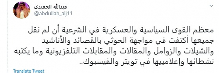 وكتب في تغريدة عبر "تويتر" رصدها "المشهد العربي": "معظم القوى السياسية والعسكرية في الشرعية أن لم نقل جميعها أكتفت في مواجهة الحوثي بالقصائد والأناشيد والشيلات والزوامل والمقالات والمقابلات التلفزيونية وما يكتبه نشطائها وإعلامييها في تويتر والفيسبوك".