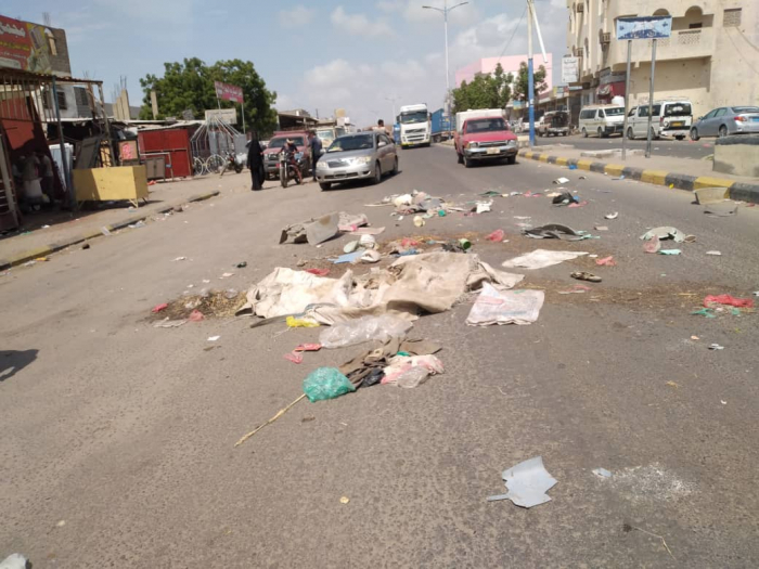 عمال نظافة بأبين يحتجون بإلقاء القمامة بالشوارع
