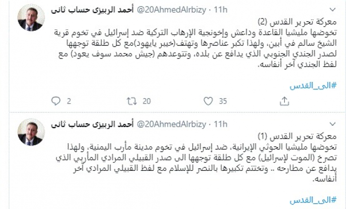 وأضاف: "معركة تحرير القدس (2) تخوضها مليشيا القاعدة وداعش وإخونجية الإرهاب التركية ضد إسرائيل في تخوم قرية الشيخ سالم في أبين، ولهذا تكبر عناصرها وتهتف (خيبر يايهود) مع كل طلقة توجهها لصدر الجندي الجنوبي الذي يدافع عن بلده، وتتوعدهم (جيش محمد سوف يعود) مع لفظ الجندي آخر أنفاسه".