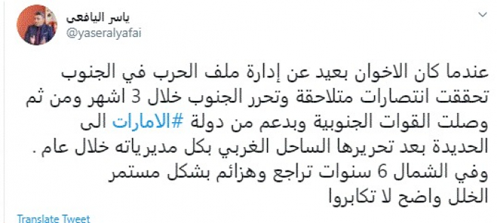 وقال في تغريدة عبر "تويتر" رصدها "المشهد العربي": "عندما كان الإخوان بعيد عن إدارة ملف الحرب في الجنوب تحققت انتصارات متلاحقة وتحرر الجنوب خلال 3 أشهر ومن ثم وصلت القوات الجنوبية وبدعم من دولة الإمارات إلى الحديدة بعد تحريرها الساحل الغربي بكل مديرياته خلال عام".