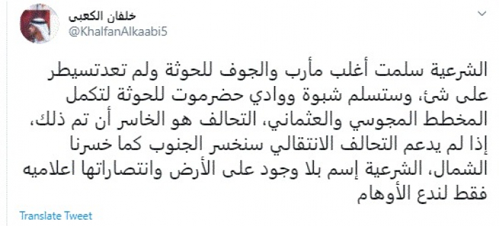الكعبي يُطالب التحالف بدعم الانتقالي.. ويؤكد: الشرعية أصبحت اسم فقط