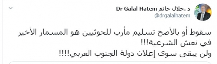 وكتب عبر تغريدة له على "تويتر" رصدها "المشهد العربي": "سقوط أو بالأصح تسليم مأرب للحوثيين هو المسمار الأخير في نعش الشرعية، ولن يبقى سوى إعلان دولة الجنوب العربي".