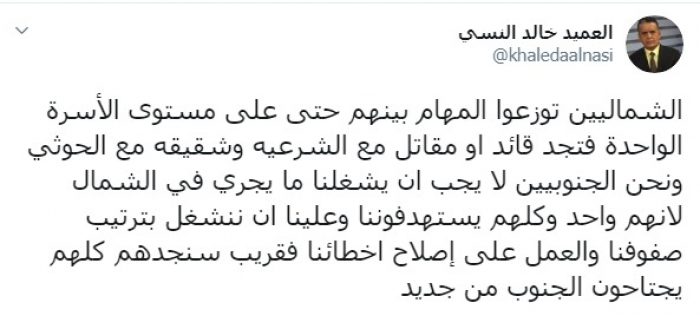 وكتب عبر تغريدة له على "تويتر" رصدها "المشهد العربي": "الشماليون توزعوا المهام بينهم حتى على مستوى الأسرة الواحدة فتجد قائدا أو مقاتلا مع الشرعية وشقيقه مع الحوثي، ونحن الجنوبيين لا يجب أن يشغلنا ما يجري في الشمال لأنهم واحد وكلهم يستهدفوننا وعلينا أن ننشغل بترتيب صفوفنا والعمل على إصلاح أخطائنا فقريبا سنجدهم كلهم يجتاحون الجنوب من جديد".