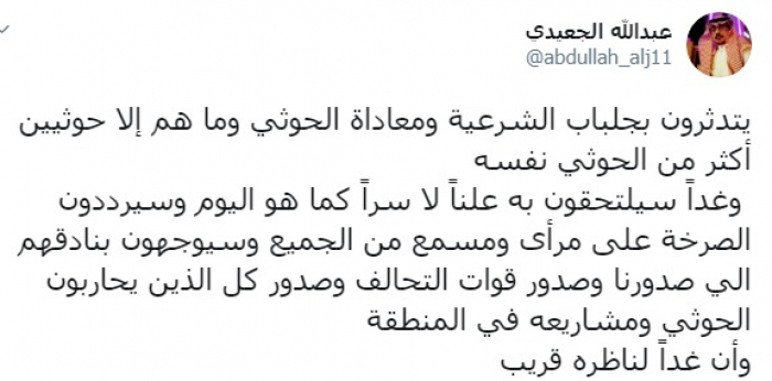 وكتب عبر تغريدة له على "تويتر" رصدها "المشهد العربي": "يتدثرون بجلباب الشرعية ومعاداة الحوثي وما هم إلا حوثيون أكثر من الحوثي نفسه، وغدا سيلتحقون به علنا لا سرا كما هو اليوم وسيرددون الصرخة على مرأى ومسمع من الجميع وسيوجهون بنادقهم إلى صدورنا وصدور قوات التحالف وصدور كل الذين يحاربون الحوثي ومشاريعه في المنطقة، وإن غدا لناظره قريب".