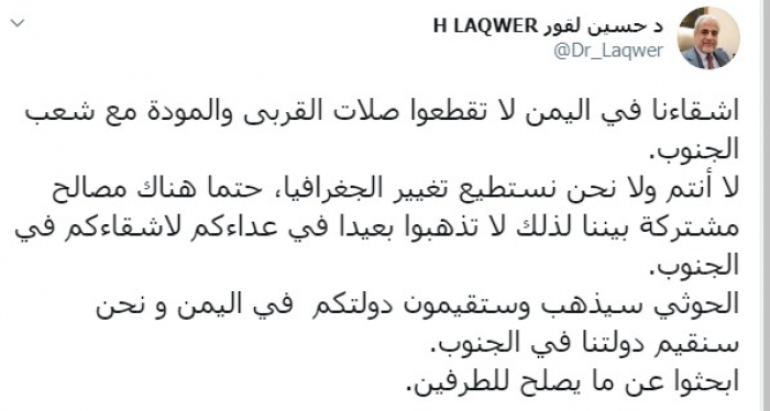 وكتب عبر تغريدة له على " تويتر" رصدها " المشهد العربي": "أشقاءنا في اليمن لا تقطعوا صلات القربى والمودة مع شعب الجنوب، لا أنتم ولا نحن نستطيع تغيير الجغرافيا، حتمًا هناك مصالح مشتركة بيننا لذلك لا تذهبوا بعيدًا في عداءكم لأشقاءكم في الجنوب، الحوثي سيذهب وستقيمون دولتكم في اليمن و نحن سنقيم دولتنا في الجنوب، ابحثوا عن ما يصلح للطرفين".