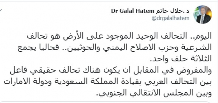 وكتب عبر تغريدة له على "تويتر" رصدها " المشهد العربي": "اليوم، التحالف الوحيد الموجود على الأرض هو تحالف الشرعية وحزب الإصلاح اليمني والحوثيين، فحاليًا يجمع الثلاثة حلف واحد، والمفروض في المقابل أن يكون هناك تحالف حقيقي فاعل بين التحالف العربي بقيادة المملكة السعودية ودولة الإمارات وبين المجلس الانتقالي الجنوبي".