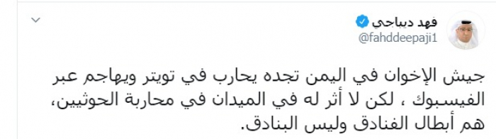 وكتب عبر تغريدة له على "تويتر" رصدها " المشهد العربي": "جيش الإخوان في اليمن تجده يحارب في تويتر ويهاجم عبر الفيسبوك ، لكن لا أثر له في الميدان في محاربة الحوثيين، هم أبطال الفنادق وليس البنادق".