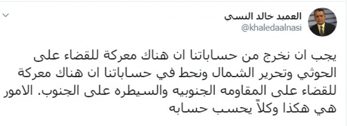 وكتب عبر تغريدة له على "تويتر" رصدها "المشهد العربي": "يجب أن نخرج من حساباتنا أن هناك معركة للقضاء على الحوثي وتحرير الشمال ونحط في حساباتنا أن هناك معركة للقضاء على المقاومة الجنوبية والسيطرة على الجنوب، الأمور هي هكذا وكل يحسب حسابه".