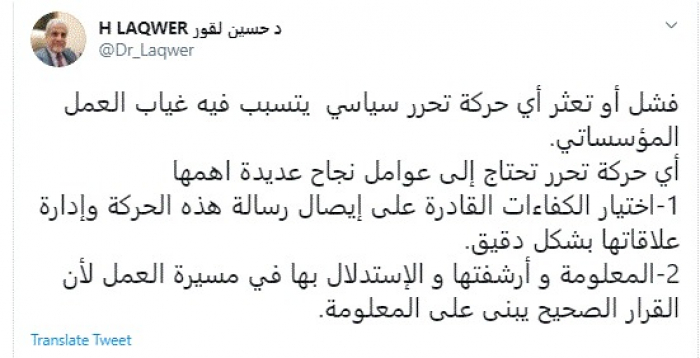 وكتب في تغريدة عبر "تويتر" رصدها "المشهد العربي": "فشل أو تعثر أي حركة تحرر سياسي يتسبب فيه غياب العمل المؤسساتي".