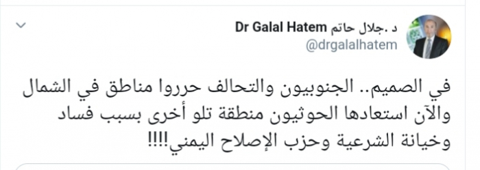 وكتب عبر تغريدة له على "تويتر" رصدها "المشهد العربي": "في الصميم، الجنوبيون والتحالف حرروا مناطق في الشمال، والآن استعادها الحوثيون منطقة تلو أخرى بسبب فساد وخيانة الشرعية وحزب الإصلاح اليمني".
