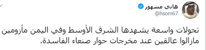 وكتب عبر تغريدة له على "تويتر" رصدها " المشهد العربي": "تحولات واسعة يشهدها الشرق الأوسط، وفي اليمن مأزومين مازالوا عالقين عند مخرجات حوار صنعاء الفاسدة".