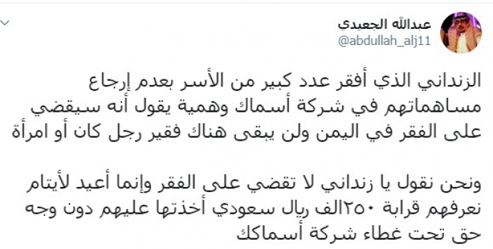 وكتب عبر تغريدة له على "تويتر" رصدها " المشهد العربي": "الزنداني الذي أفقر عدد كبير من الأسر بعدم إرجاع مساهماتهم في شركة أسماك وهمية يقول أنه سيقضي على الفقر في اليمن ولن يبقى هناك فقير رجل كان أو امرأة، ونحن نقول يا زنداني لا تقضي على الفقر وإنما أعد لأيتام نعرفهم قرابة ٢٥٠ ألف ريال سعودي أخذتها عليهم دون وجه حق تحت غطاء شركة أسماكك".