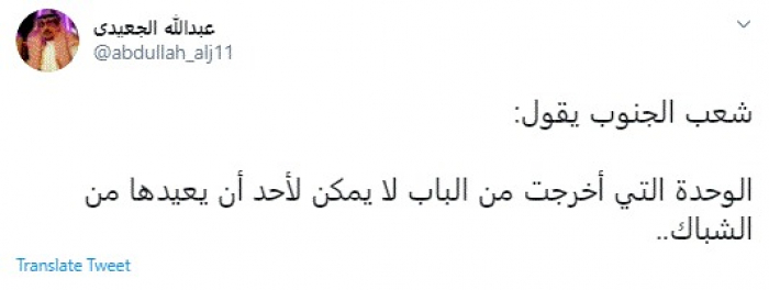 وكتب في تغريدة عبر "تويتر" رصدها "المشهد العربي": "شعب الجنوب يقول: الوحدة التي أخرجت من الباب لا يمكن لأحد أن يعيدها من الشباك".