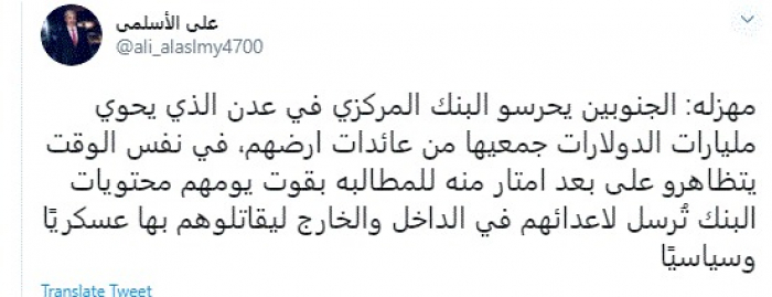 وكتب في تغريدة عبر "تويتر" رصدها "المشهد العربي": "مهزلة: الجنوبيين يحرسوا البنك المركزي في عدن الذي يحوي مليارات الدولارات جميعها من عائدات أرضهم، في نفس الوقت يتظاهرون على بعد أمتار منه للمطالبة بقوت يومهم؛ محتويات البنك تُرسل لأعدائهم في الداخل والخارج ليقاتلوهم بها عسكريًا وسياسيًا".