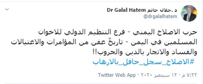 وكتب "حاتم" تغريدة بتويتر، رصدها "المشهد العربي": "الإصلاح اليمني - فرع التنظيم الدولي للإخوان المسلمين في اليمن - تاريخٌ عفن من المؤامرات والاغتيالات والفساد والاتجار بالدين والحروب".