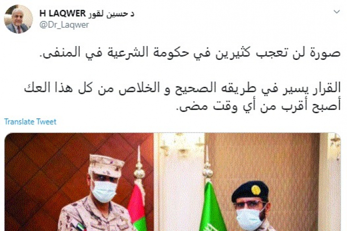 وقال في تغريدة عبر "تويتر" رصدها "المشهد العربي": "صورة لن تعجب كثيرين في حكومة الشرعية في المنفى".