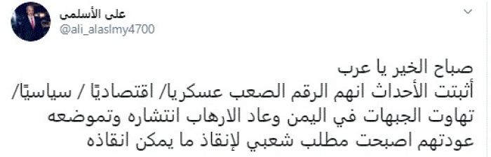 وقال في تغريدة عبر "تويتر" رصدها "المشهد العربي": "صباح الخير يا عرب أثبتت الأحداث أنهم الرقم الصعب عسكريًا/ اقتصاديًا / سياسيًا".