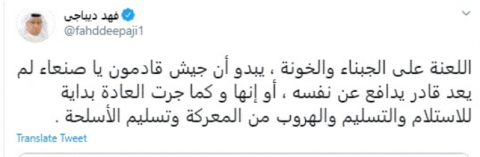 وقال في تغريدة عبر "تويتر" رصدها "المشهد العربي": "اللعنة على الجبناء والخونة، يبدو أن جيش قادمون يا صنعاء لم يعد قادر يدافع عن نفسه، أو إنها وكما جرت العادة بداية للاستلام والتسليم والهروب من المعركة وتسليم الأسلحة".