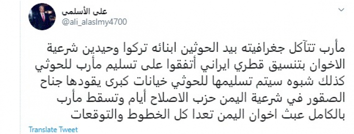 وقال في تغريدة عبر "تويتر" رصدها "المشهد العربي": "مأرب تتآكل جغرافيته بيد الحوثيين، أبنائه تركوا وحيدين".