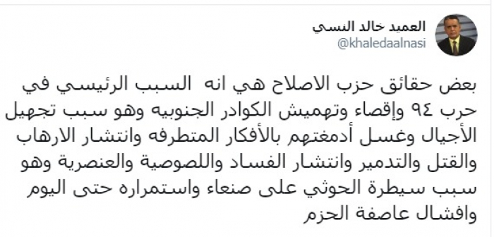 وكتب عبر تغريدة له على "تويتر" رصدها "المشهد العربي": "بعض حقائق حزب الإصلاح هي أنه السبب الرئيسي في حرب ٩٤ وإقصاء وتهميش الكوادر الجنوبية وهو سبب تجهيل الأجيال وغسل أدمغتهم بالأفكار المتطرفة وانتشار الإرهاب والقتل والتدمير وانتشار الفساد واللصوصية والعنصرية وهو سبب سيطرة الحوثي على صنعاء واستمراره حتى اليوم وإفشال عاصفة الحزم".