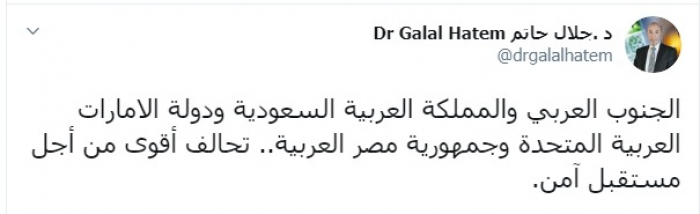 وكتب عبر تغريدة له على "تويتر" رصدها "المشهد العربي": "الجنوب العربي والمملكة العربية السعودية ودولة الإمارات العربية المتحدة وجمهورية مصر العربية، تحالف أقوى من أجل مستقبل آمن".